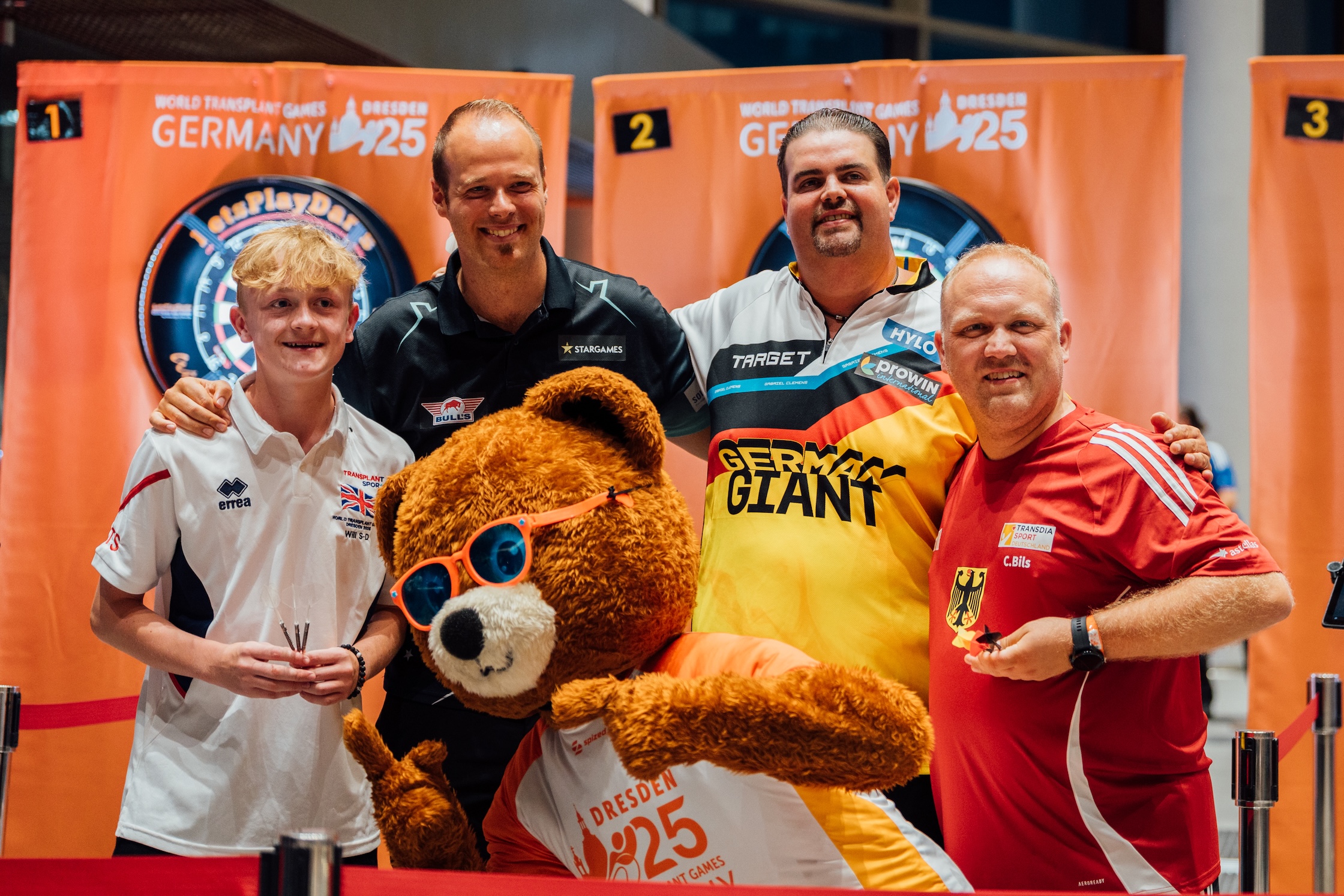 Mit der Darts Night am 21. August 2025 im Stadtforum Dresden wurde ein weiteres sportliches Highlight der World Transplant Games gesetzt. Im voll besetzten Saal mit 400 Gästen führten Deutschlands Darts-Stars Gabriel Clemens („The German Giant“) und Max Hopp („The Maximiser“) als Moderatoren durch die finalen Wettkämpfe dieser Disziplin. In mitreißender Atmosphäre gaben sie spannende Einblicke, kommentierten die Spiele live, lieferten sich ein hochklassiges Showmatch und erfüllten im Anschluss zahlreiche Autogrammwünsche. Als erstes Sportevent dieser Art im Stadtforum unter der Unterstützung der Stadt Dresden markiert die Darts Night einen neuen Meilenstein für Eventformate mit gesellschaftlicher Wirkung. Die Verbindung aus Spitzensport, Inklusion und Unterhaltung sorgte für Begeisterung bei Athleten, Fans und Ehrengästen – und zeigt, wie professionell Sportevents mit Botschaft inszeniert werden können.